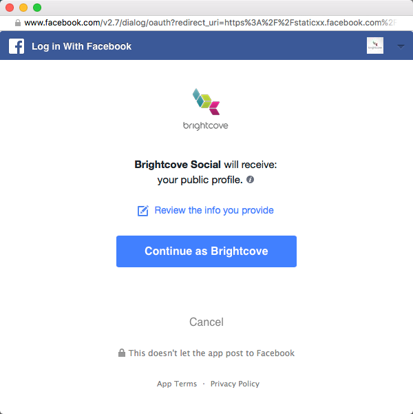 - 將會開啟一個對話方塊,確認 Brightcove Social 會收到您的個人檔案資訊。按一下「繼續」。