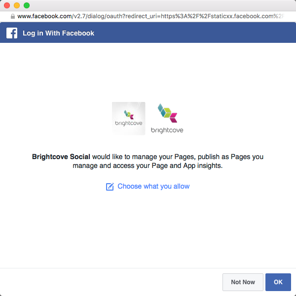- 將會開啟一個對話方塊,確認 Brightcove Social 能夠管理和發佈您的網頁,並存取您的頁面和應用程式深入解析。按一下「確定」。