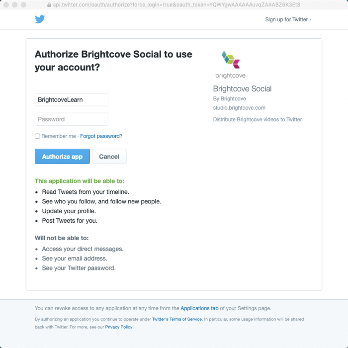 - 系統會提示您登入您的 Twitter 帳戶,並授權布萊特灣社群使用您的帳戶。登入您想要發佈影片的帳戶。如果系統未提示您登入,您可能會登入 Twitter 帳戶。請確認您已登入正確的帳號,然後再繼續進行。請點擊授權應用。