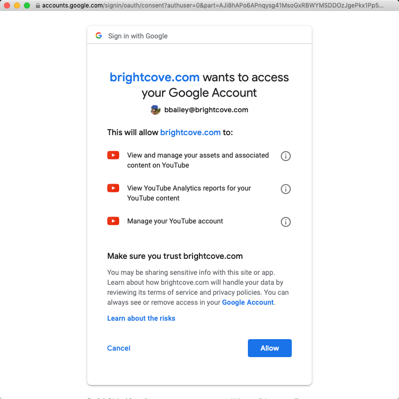 - 系統會開啟一個對話方塊,要求管理您的 YouTube 帳戶的權限。請檢查對話方塊右上角,確認您使用的是正確的 Google 帳戶。如果沒有,請使用下拉式清單來選取您要發佈影片的 Google 帳戶。按一下「允許」。