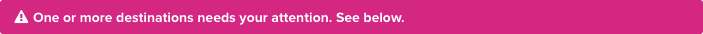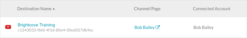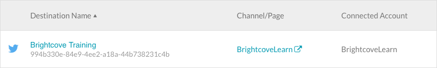 錯誤圖標()將顯示在目的地名稱旁邊。如果 Brightcove 權限已從社交媒體帳戶中移除,或者建立目的地時所使用的認證不再有效,就可能發生這種情況。若要解決此問題: