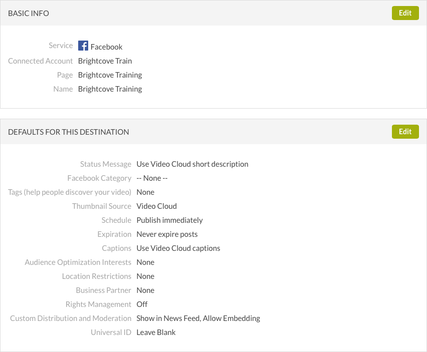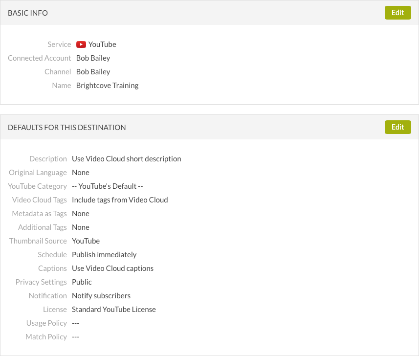 - 將顯示基本資訊和目的地預設值。按一下「基本資訊」區段中的「編輯」按鈕,以編輯目的地名稱。見設置YouTube默認值部分提供有關配置默認值的信息。