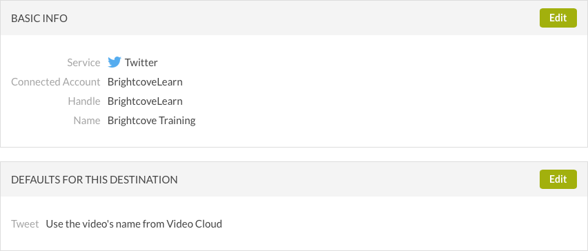 - 將顯示基本資訊和目的地預設值。按一下「基本資訊」區段中的「編輯」按鈕,以編輯目的地名稱。見設置Twitter默認值部分提供有關配置默認值的信息。
