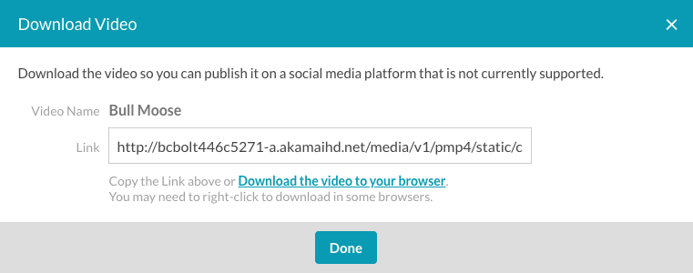 Brightcove Social 提供了複製視頻 URL 或下載視頻源文件的能力。下載時,會下載最高品質的 MP4 轉譯。如果沒有 MP4 轉譯,則會停用「下載」連結。