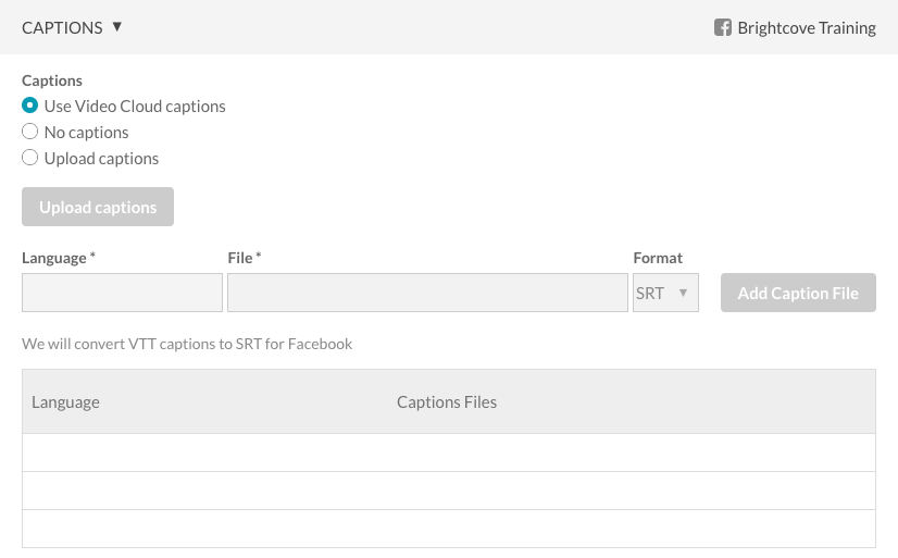 通過“設置”菜單和“隱藏式字幕”菜單在Facebook播放器中對觀看者可見。建議您將文字軌標籤設定為對觀眾有意義的項目。例如,這些語言中不同語言的標示字幕。) - 沒有字幕 -不會將字幕傳送到 YouTube