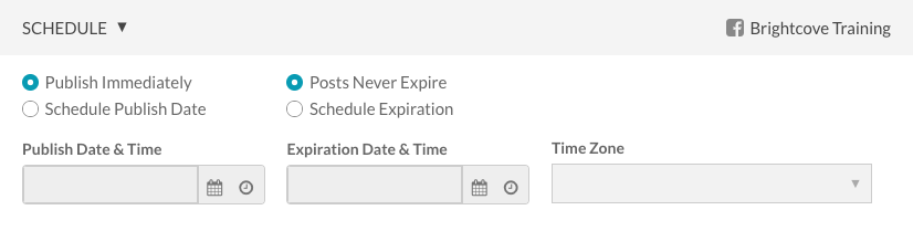 點擊時間表鏈接。選擇立即發布立即發布視頻或選擇計劃發布日期然後選擇一個發布日期和時間。您還可以設置帖子永不過期或選擇時間表到期然後選擇一個到期日期和時間。一種時區也可以選擇。
