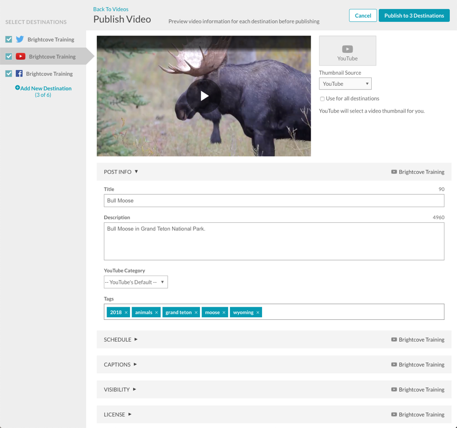 布萊特灣社會允許您輕鬆地將視頻發佈在您的視頻雲帳戶到 YouTube,臉書和推特。您必須先建立要發佈視訊的社交帳戶的發佈目的地,才能發佈視訊。如需有關建立發佈目的地的資訊,請參閱建立社交媒體發佈目的地。