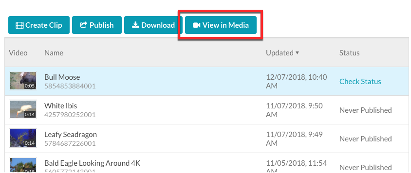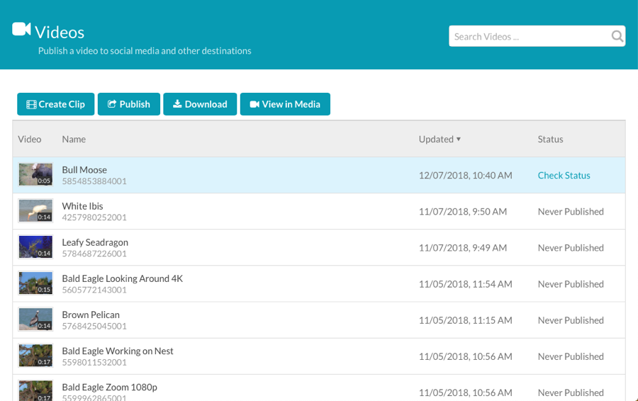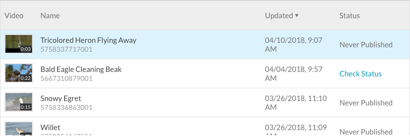 - 按一下左側導覽中的 [ 影片 ]。您的視訊雲端帳戶中的影片清單將會顯示出來。尚未發佈到社交媒體帳戶的視頻將顯示一個狀態的從未發表。已發布的視頻將顯示檢查狀態。按一下連結,即可查看社交媒體目的地上影片的發佈狀態。