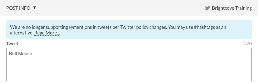點擊發布信息鏈接並輸入鳴叫內容。請注意,當被發送到推特時,@mentions 將被轉換為 #hashtags。有關更多信息,請參閱博客文章,在Brightcove Social中棄用Twitter @mentions。