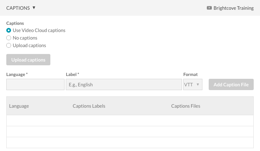- 上傳字幕 -按一下「上傳字幕」,然後瀏覽並選取字幕檔案。字幕檔案應該是 .VTT 或 .SRT 格式。選擇標題語言,添加一個標籤然後選擇格式。按一下「新增標題檔案」。