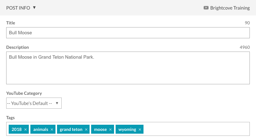 - 標籤 -視頻標籤(默認為視頻雲標籤)。沒有特定的標籤數限制;每個標籤最多可以使用 30 個字元,文字欄位最多可接受 500 個字元。