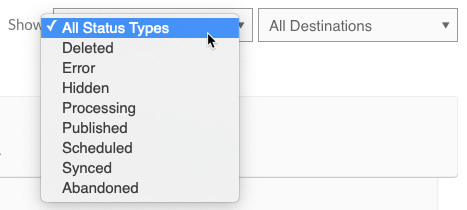 頁面頂端提供根據發佈狀態或目的地篩選清單的選項。可用的發佈狀態如下: