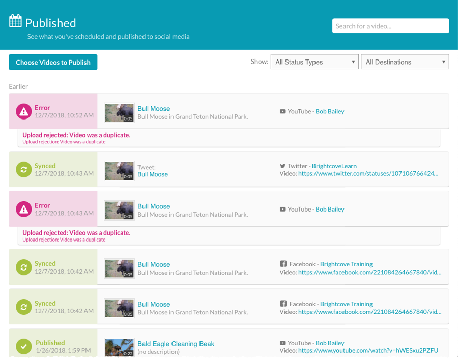 當您打開Brightcove Social或單擊已發表在左側導航中,將顯示使用Brightcove Social發布的視頻列表。